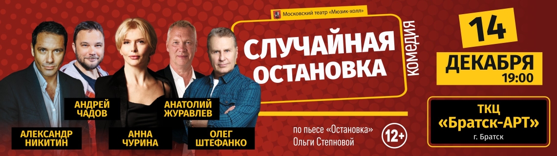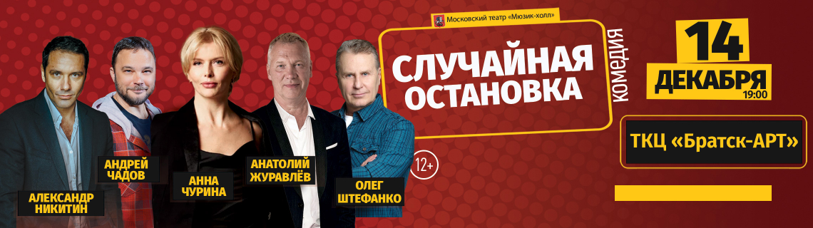 Московский театр "Мюзик-холл" продолжает гастрольный сезон премьерой комедии «Случайная остановка», которая будет показана в г. Братск 14 декабря 2025г. в 19:00 на сцене «ТКЦ «Братск-АРТ». Спектакль поставлен по пьесе «Остановка» писательницы и драматурга Ольги Степновой. Зрителей порадует по-настоящему звездный актерский состав: Александр Никитин, Андрей Чадов, Олег Штефанко / Анатолий Журавлёв, Павел Баршак, Анна Чурина. Организаторы привозят реквизит, декорации, костюмы, и поклонники драматического искусства смогут увидеть постановку именно в том виде, в каком она идет на домашней сцене в г. Москве.