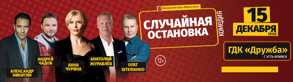 Московский театр "Мюзик-холл" гастрольный сезон премьерой комедии «Случайная остановка», которая будет показана в г. Усть-Илимск 15 декабря 2025г. в 19:00 на сцене ГДК "Дружба". Спектакль поставлен по пьесе «Остановка» писательницы и драматурга Ольги Степновой. Зрителей порадует по-настоящему звездный актерский состав: Александр Никитин, Андрей Чадов, Олег Штефанко / Анатолий Журавлёв, Павел Баршак, Анна Чурина. Организаторы привозят реквизит, декорации, костюмы, и поклонники драматического искусства смогут увидеть постановку именно в том виде, в каком она идет на домашней сцене в г. Москве.