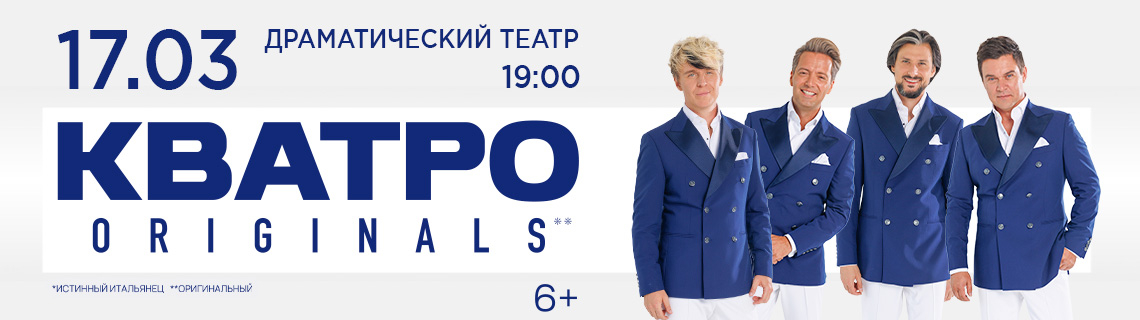 Italiano vero – это уникальный концерт группы «Кватро», раскрывающий всю красоту и многообразие оттенков итальянской музыки. Это особенный вечер, в программе которого прозвучат знакомые, всеми любимые, красивые мелодии на итальянском языке в оригинальном прочтении и исполнении великолепных голосов группы «Кватро».