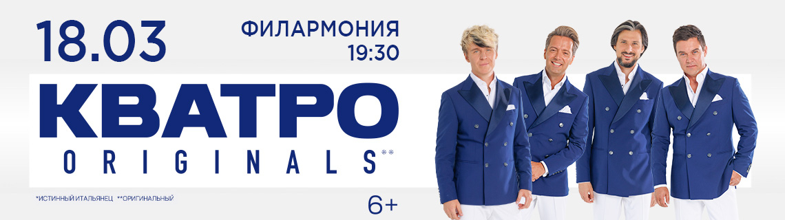 Italiano vero – это уникальный концерт группы «Кватро», раскрывающий всю красоту и многообразие оттенков итальянской музыки. Это особенный вечер, в программе которого прозвучат знакомые, всеми любимые, красивые мелодии на итальянском языке в оригинальном прочтении и исполнении великолепных голосов группы «Кватро».