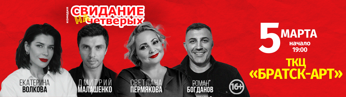 Столичное гастрольное агентство представит в сибирском регионе комедию «Свидание на четверых», которая будет показана в г. Братске 05 марта 2026 г. в 19:00 в Театрально-концертном центре «Братск-АРТ». В основу спектакля легла пьеса «Нелётная погода...» сценариста и драматурга Алексея Щеглова. В спектакле заняты звёзды российского театра, кино и телевидения: Светлана Пермякова, Екатерина Волкова, Роман Богданов и Дмитрий Малашенко. За последние несколько лет эта комедия завоевала зрительский успех и признание театралов от Калининграда до Петропавловска-Камчатского, сохраняя актёрскую энергию и яркий актуальный юмор.