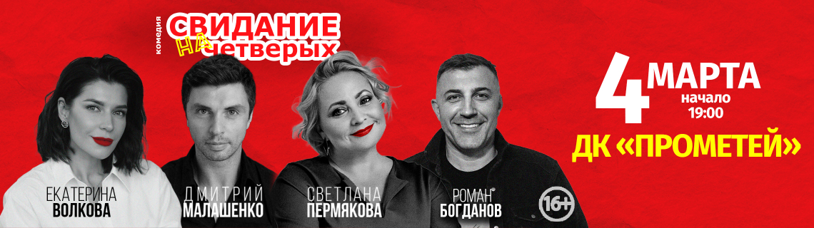 Столичное гастрольное агентство представит в сибирском регионе комедию «Свидание на четверых», которая будет показана в г. Тулуне 04 марта 2026 г. в 19:00 во Дворце культуры «Прометей». В основу спектакля легла пьеса «Нелётная погода...» сценариста и драматурга Алексея Щеглова. В спектакле заняты звёзды российского театра, кино и телевидения: Светлана Пермякова, Екатерина Волкова, Роман Богданов и Дмитрий Малашенко. За последние несколько лет эта комедия завоевала зрительский успех и признание театралов от Калининграда до Петропавловска-Камчатского, сохраняя актёрскую энергию и яркий актуальный юмор.