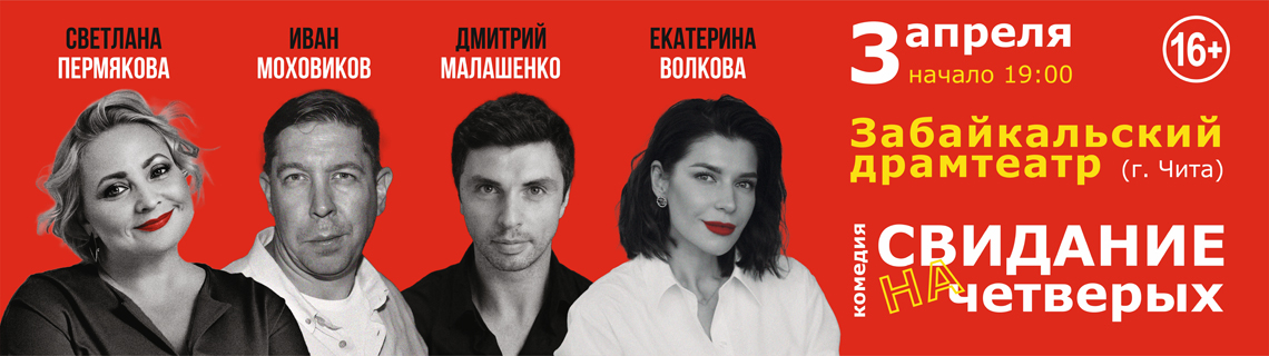 Столичное гастрольное агентство по следам Международного дня смеха представит в г. Чите комедию «Свидание на четверых», которая будет показана 03 апреля 2026 г. в 19:00 на сцене Забайкальского краевого драматического театра им. Н.А. Березина. В основу спектакля легла пьеса «Нелётная погода...» сценариста и драматурга Алексея Щеглова. В спектакле заняты звёзды российского театра, кино и телевидения: Светлана Пермякова, Иван Моховиков, Дмитрий Малашенко и Екатерина Волкова. За последние несколько лет эта комедия завоевала зрительский успех и признание театралов от Калининграда до Петропавловска-Камчатского, сохраняя актёрскую энергию и яркий актуальный юмор.