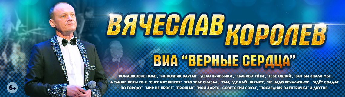 Основатель и солист ВИА «Верные сердца» Вячеслав Королев вместе с музыкантами представят в своей программе не только отборные хиты 70-х, но и лучшие новые песни, написанные как в жанре ВИА, так и в стиле современной эстрады, которым публика кричала «Браво!» на многочисленных концертах коллектива: «Ромашковое поле», «Тебе одной», «Дело привычки», «Красиво уйти», «Вот бы знали мы», «Танцуй со мной», «Моника», которые можно послушать на любой музыкальной площадке в Интернете.