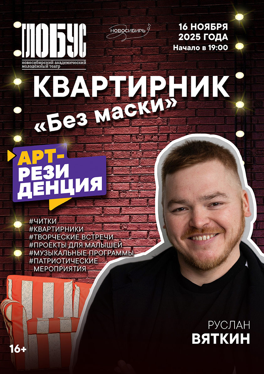 Арт-резиденция театра «Глобус» представляет квартирник «Без маски». Герой встречи – актер Руслан Вяткин. Уютное пространство, приглушенный свет, мерцающий экран. В камерной атмосфере, в дружеской беседе о жизни, ролях и событиях, в калейдоскопе видеофрагментов, забавных конкурсов и актерских импровизаций поклонники узнают Руслана с новых, порой неожиданных сторон. Квартирник предлагает пережить уникальный зрительский опыт: артист без маски, на расстоянии вытянутой руки, с настоящими эмоциями и личными историями.