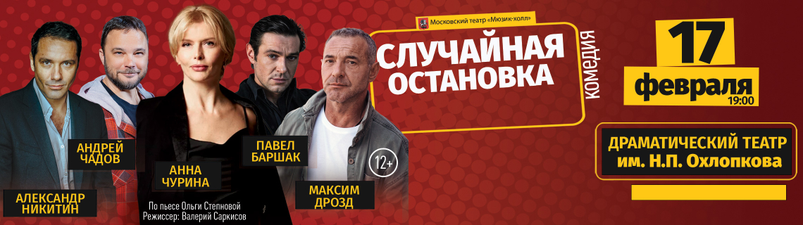 Московский театр «Мюзик-холл» продолжает гастрольный сезон премьерой комедии «Случайная остановка», которая будет показана, в г. Иркутск 17 февраля 2026г. в 19:00 на сцене Академического драматического театра им. Н.П. Охлопкова. Спектакль поставлен по пьесе «Остановка» писательницы и драматурга Ольги Степновой. Зрителей порадует по-настоящему звездный актерский состав: Александр Никитин, Андрей Чадов, Анна Чурина, Павел Баршак / Максим Дрозд.
