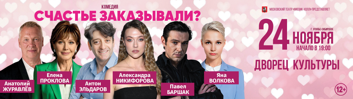 Московский театр «Мюзик-холл» продолжает гастрольный сезон премьерой комедии «Счастье заказывали?», которая будет показана 24 ноября 2025г. в г. Усолье-Сибирское в 19:00 на сцене ДВОРЦА КУЛЬТУРЫ. Спектакль поставлен по пьесе «Выдать Джанет замуж» сценариста и продюсера Сэма Бобрика. Зрителей порадует по-настоящему звездный актерский состав: Засл. арт. России Елена Проклова, Александра Никифорова, Павел Баршак / Антон Эльдаров, Анатолий Журавлёв, Яна Волкова.