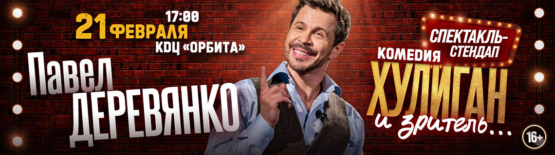 Приглашаем вас стать свидетелями театрального шоу с элементами стендапа, собирающее аншлаги по всему миру. В главной роли — Павел Деревянко, который представит вам свою эксцентричную шоу-комедию «Хулиган и… зритель».